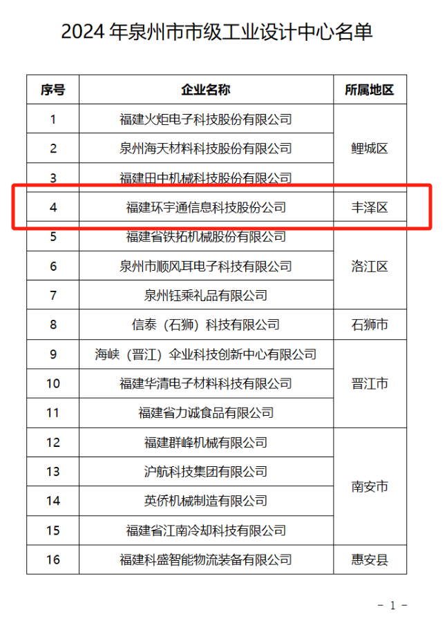 根据《泉州市工业和信息化局关于组织申报2024年市级工业设计中心的通知》(泉工信服务〔2024〕79号)精神,经研究,确定福建火炬电子科技股份有限公司等25家企业的工业设计中心为2024年泉州市市级工业设计中心,现予以公布。